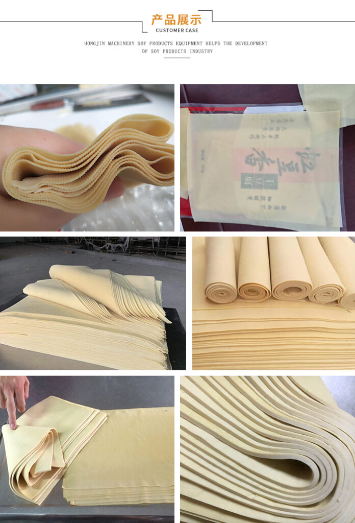 - La ligne de production de la machine à peau de tofu est automatisée en ce qui concerne le broyage et l’ébullition, l’alimentation en pâte de soja, le pulvérisation de pâte et le moulage, ainsi que le pressage et le pelage de la peau ;