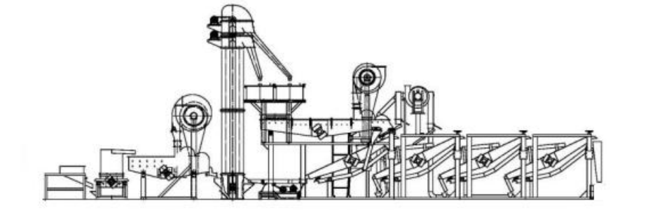 Trémie d’alimentation, élévateur à vis, machine multifonction de retrait des impuretés, élévateur à godets, quatre machines principales de retrait, machine de tri (3 unités), dispositif de retour d’air par aspiration, trémie d’alimentation, armoire électrique (voir figure ci-dessous pour les détails)